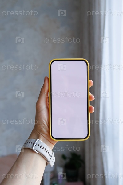 Крупный план человеческой руки, держащей черный белый экран мобильного телефона на внутреннем фоне. макет