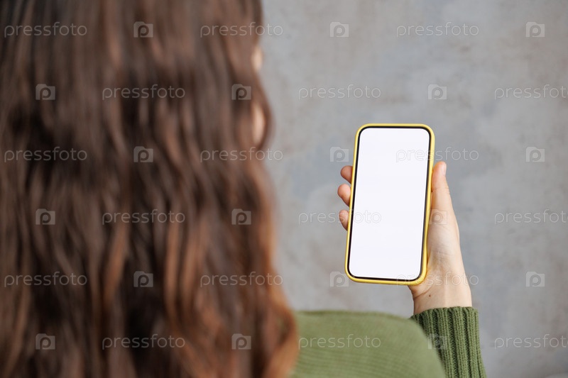 Женщина крупным планом в зеленом сидя в помещении с помощью смартфона. макет смартфона