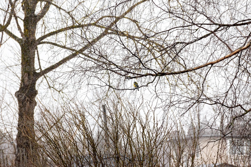 Маленькая птичка Большая синяжка (лат. parus major) сидит на влажной ветви дерева.Дождливая погода и облачное небо
