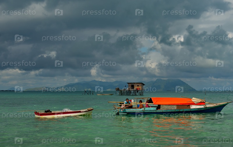 Семпорна. Малайзия. 30 ноября 2018 года. Ранним теплым утром длинные рыбацкие лодки на рифовых отмелях поджидают рыбаков из деревни морских цыган