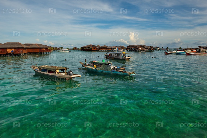 Семпорна. Малайзия. 30 ноября 2018 года. Ранним теплым утром длинные рыбацкие лодки на рифовых отмелях поджидают рыбаков из деревни морских цыган