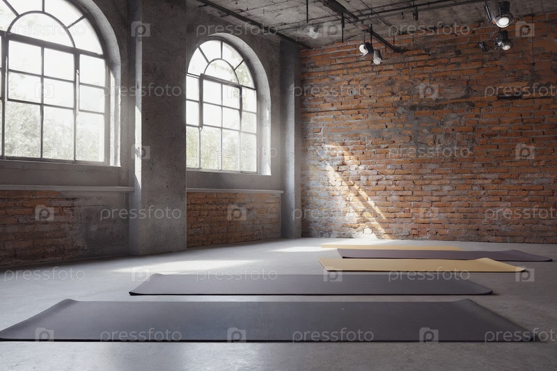 AI Generative Fitness тренажерный зал интерьер, ковры для йоги и спортивное оборудование, лежащий на полу