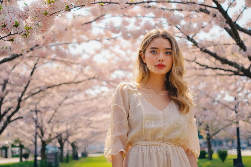 Генеративная женщина, стоящая под ветвями японского вишневого дерева с розовыми цветами сакура