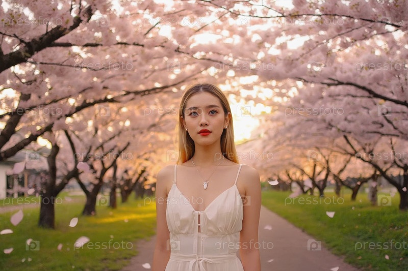Генеративная женщина, стоящая под ветвями японского вишневого дерева с розовыми цветами сакура