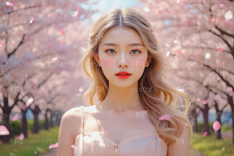 Генеративная женщина, стоящая под ветвями японского вишневого дерева с розовыми цветами сакура