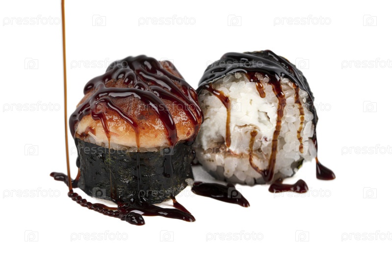 Суши изолированы на белом фоне. Запеченные суши с соевым соусом
