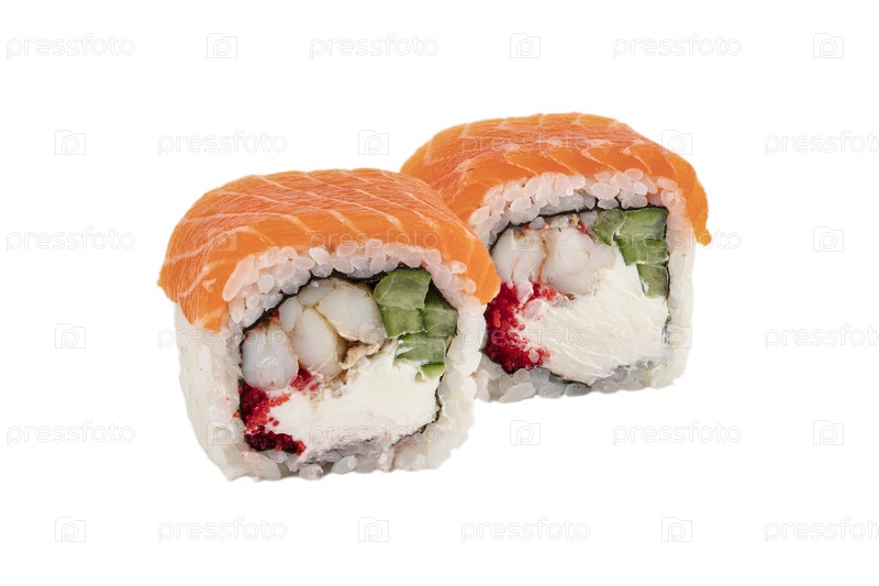 Суши крупным планом изолированы на белом фоне. Суши-ролл, запеченный красной рыбой, форелью, филадельфийским сыром и угрем, дайконом. Меню японского ресторана