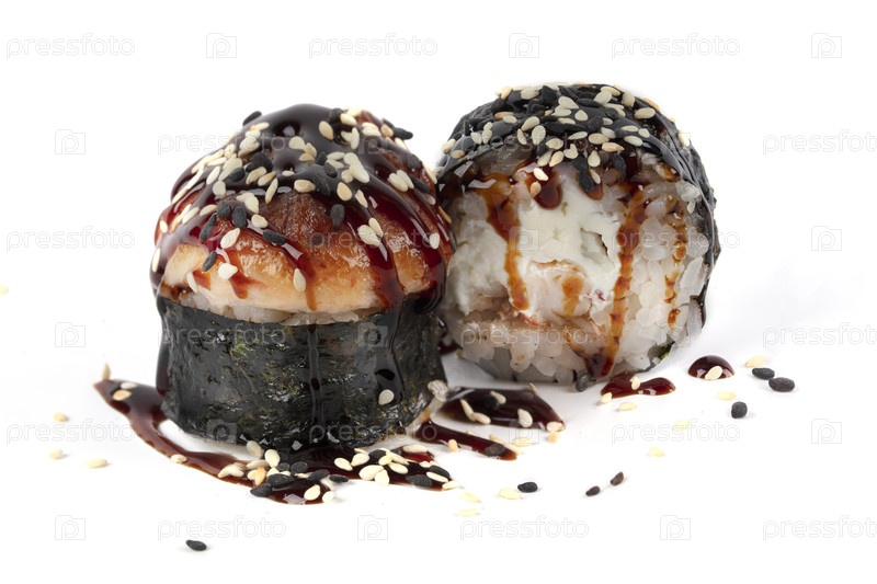 Суши изолированы на белом фоне. Выпеченные суши покрыты соевым соусом и посыпаны семенами кунжута