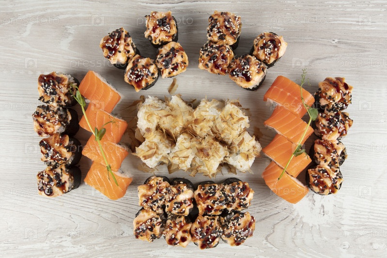 Набор различных суши-роллов на белом деревянном фоне крупным планом