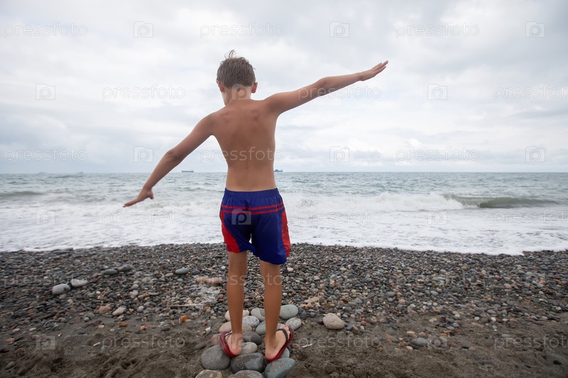 Мальчик идет вдоль скалистого берега моря. Отдых на море на летних каникулах