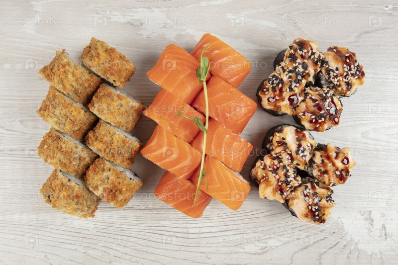 Набор различных суши-роллов на белом деревянном фоне крупным планом
