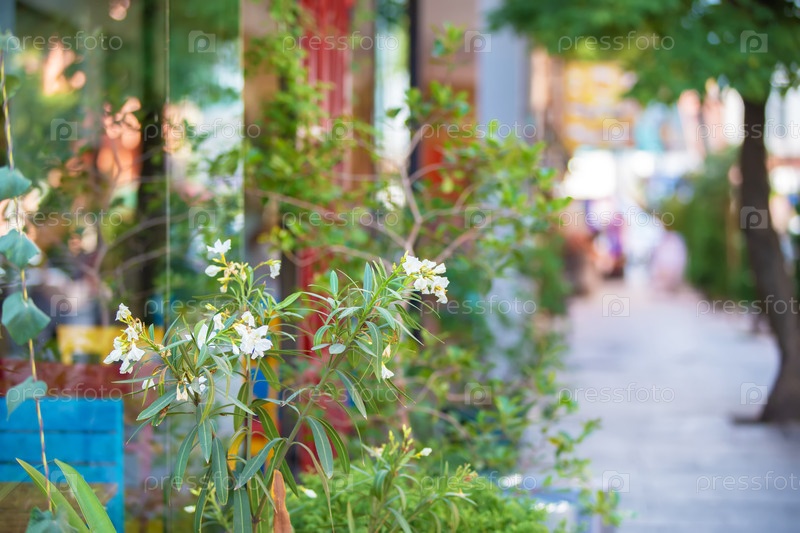 Вегетативный фон белых олеандровых цветов на фоне улицы