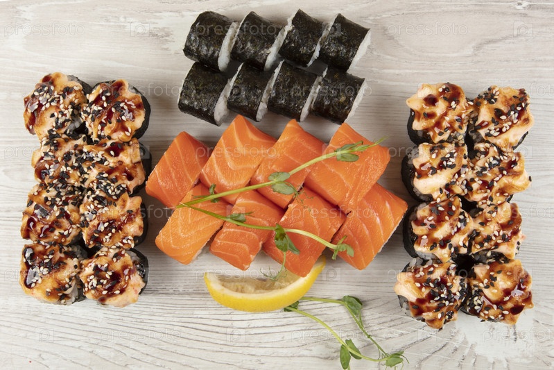 Набор различных суши-роллов на белом деревянном фоне. Японская еда