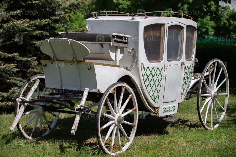 Старинная белая карета XIX века на зеленой лужайке.Прототип современного автомобиля