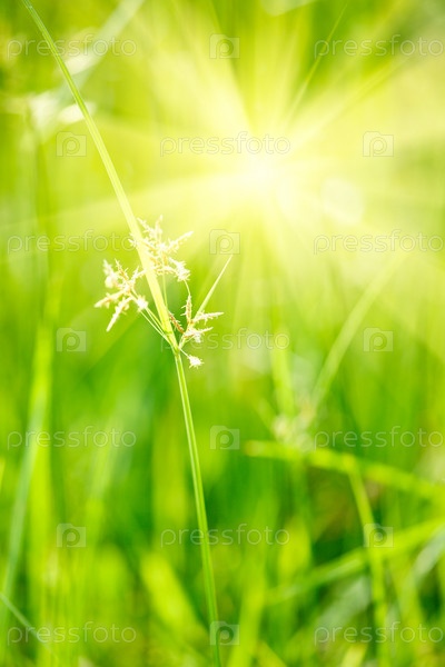 Зеленая трава под солнечными лучами крупным планом