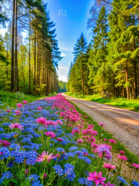 Поле голубых и розовых цветов рядом с лесом. Генерирующий ИИ