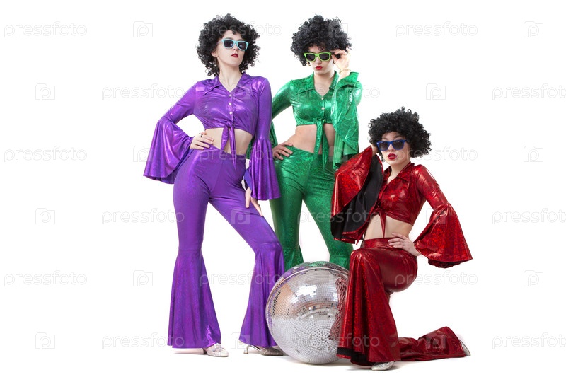 Три девушки на белом фоне позируют с дискотекой. Одежда семидесятых или восьмидесятых годов для диско-вечеринки