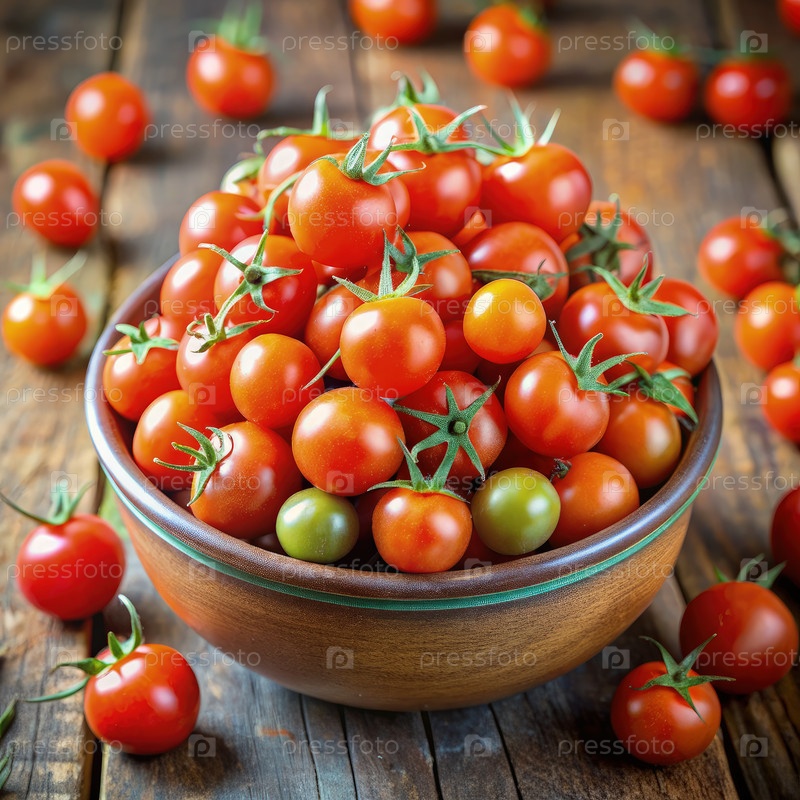 Чаша вишневых помидоров на деревянном столе. Генерирующий ИИ
