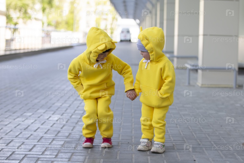 Маленький брат и сестра. Смешные дети мальчик и девочка в желтых одинаковых костюмах играют на открытом воздухе