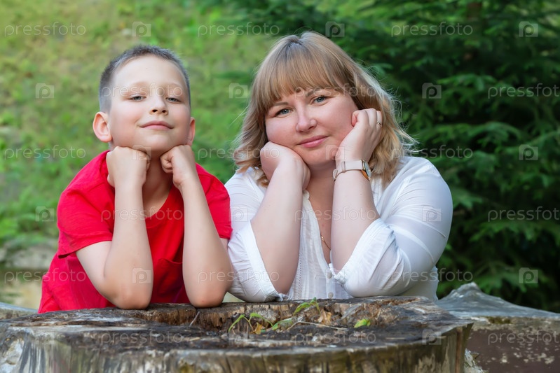Счастливые мама и сын на летней прогулке смотрят на улыбающуюся камеру