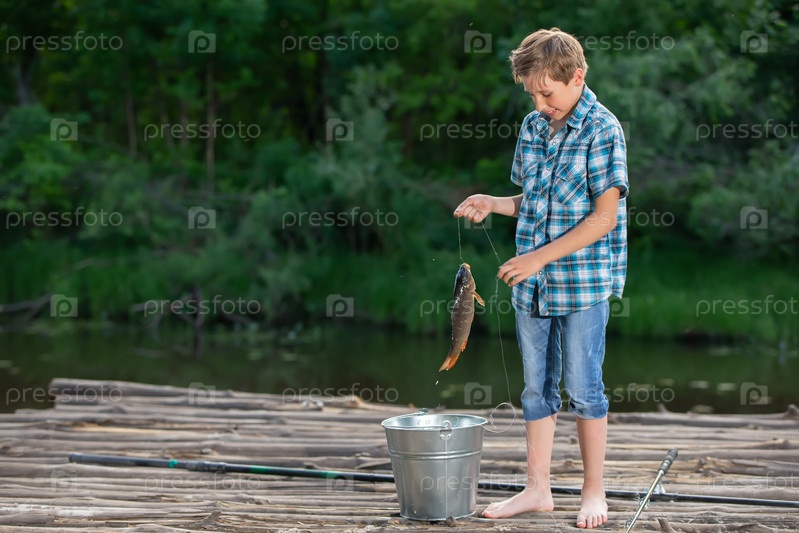 Мальчик-рыбак стоит на деревянном мосту и смотрит на пойманного карпа