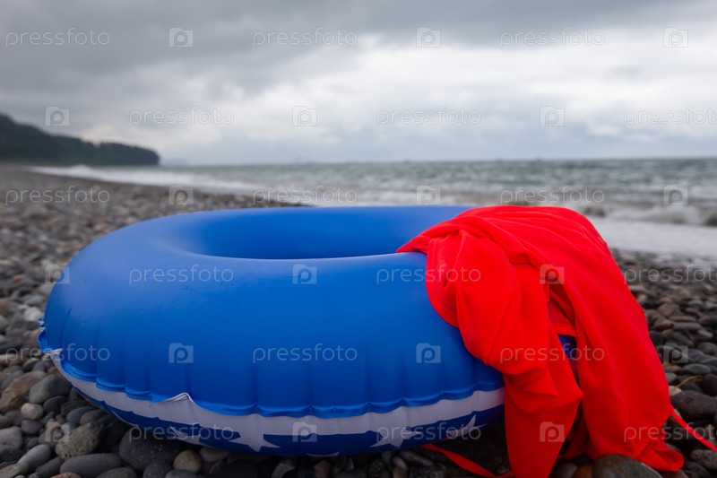 Голубой резиновый спасательный буй на берегу галечного пляжа