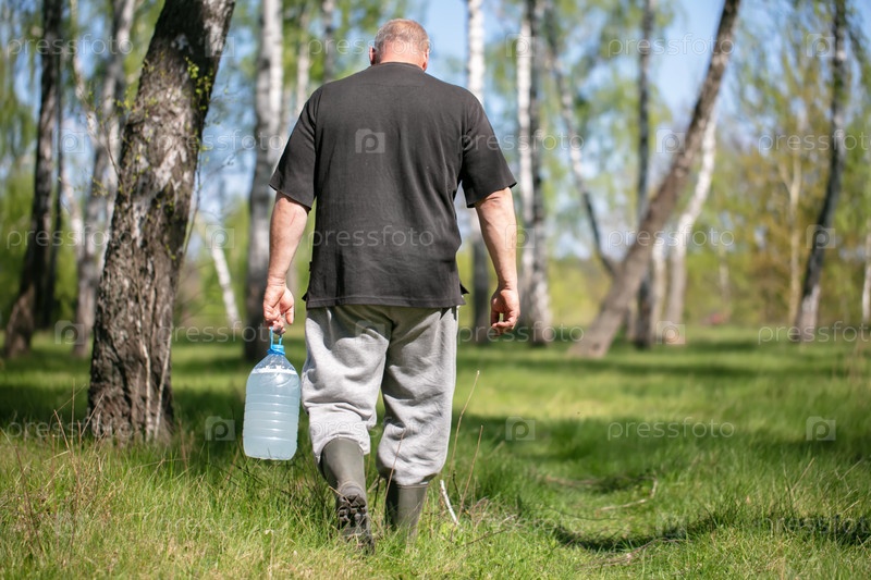 Мужчина несет банку, наполненную березовым соком, в березовой роще
