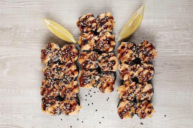 Набор запеченных рулонов суши, посыпанных семенами кунжута на белом деревянном фоне