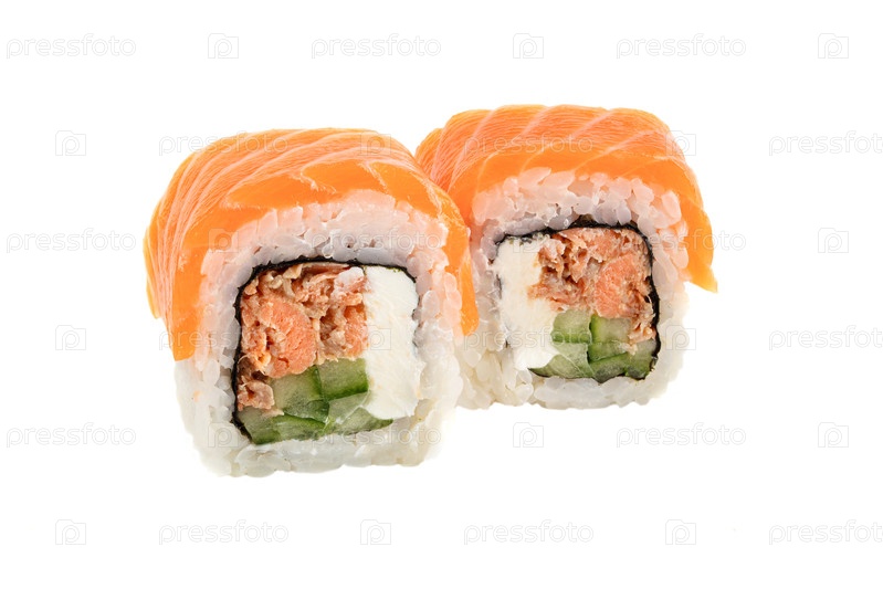 Суши крупным планом изолированы на белом фоне. Суши-ролл с красной рыбой, форелью, филадельфийским сыром и огурцом. Меню японского ресторана