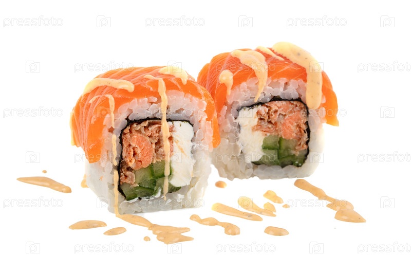 Суши крупным планом изолированы на белом фоне. Суши-ролл с красной рыбой, форелью, филадельфийским сыром и огурцом, покрытым кунжутным соусом. Меню японского ресторана