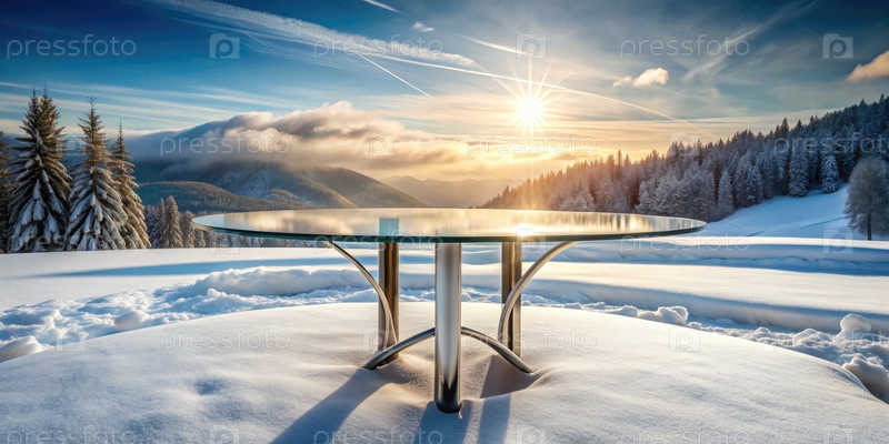 Стеклянный стол на покрытом снегом поле. Генерирующий ИИ
