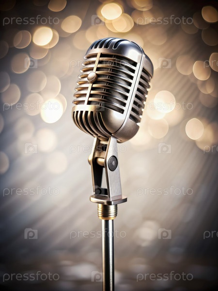 Старомодный микрофон на стенде с размытым фоном. Генерирующий ИИ