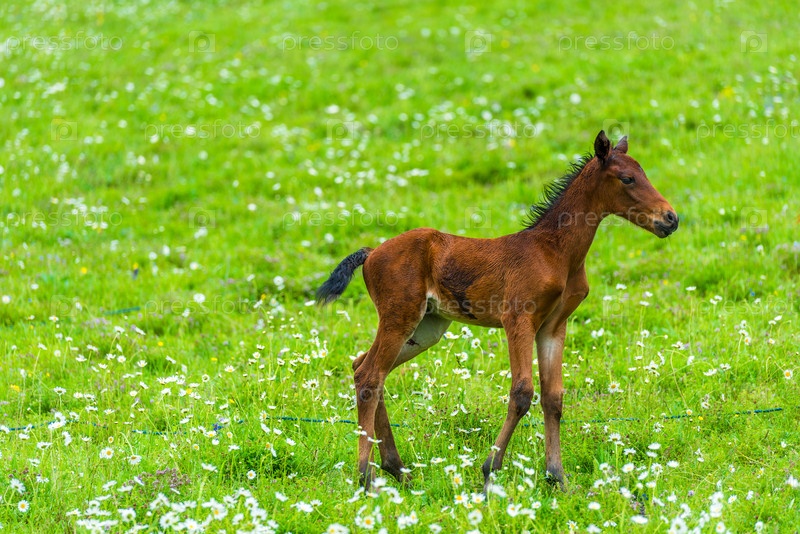 Маленький коричневый жеребенок на фоне зеленого сочного луга закрывают