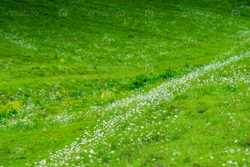 Зеленые поля на холмах с белыми ароматными маргаритками