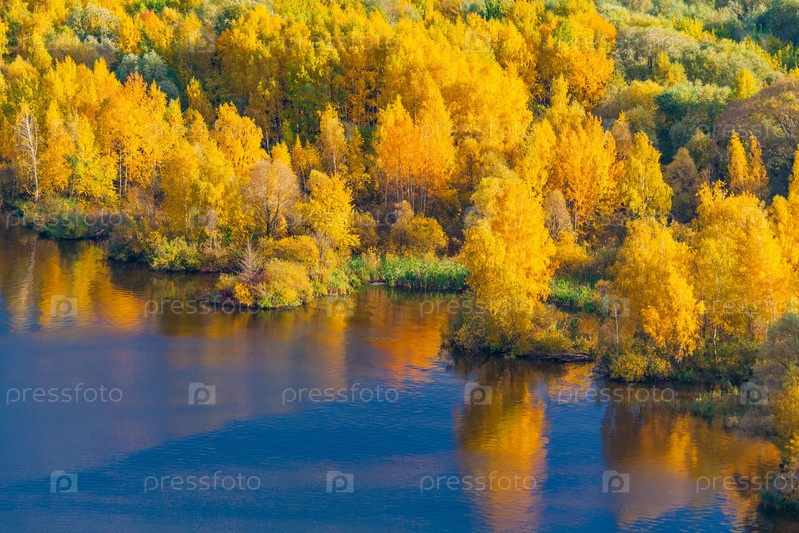 Вид на осенний лес с желтой листвой на берегу реки