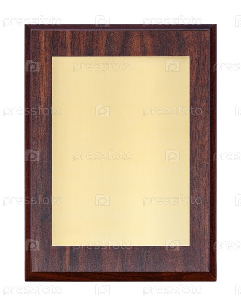 Золотая табличка или доска объявлений (диплом) в деревянной раме, изолированная на белом фоне