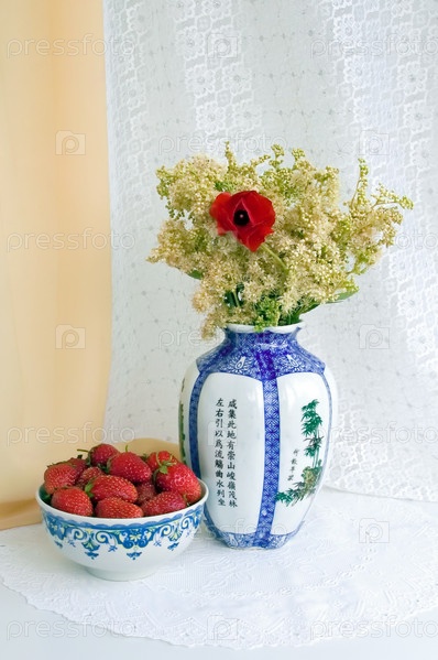 Чашка с клубникой, ваза с полевыми и садовыми цветами на столе с белой салфеткой на фоне бежевой шторы и белой тюли
