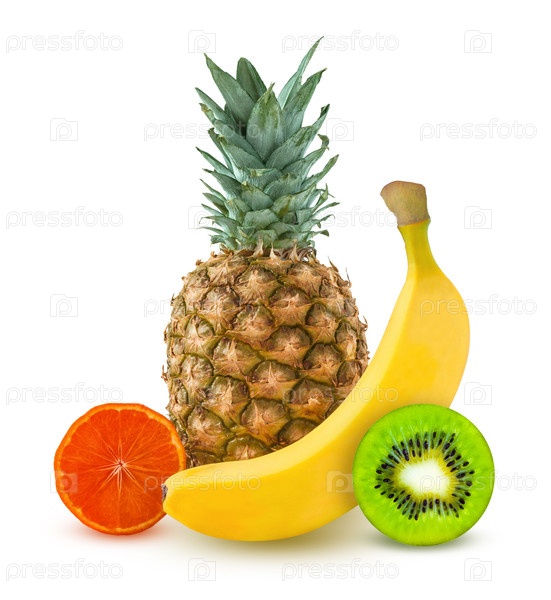 Тропические фрукты, ананас, банан, апельсин, киви выделены на белом фоне