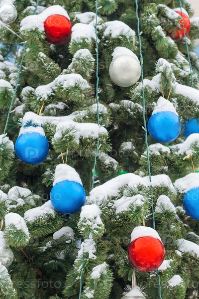 Шары на рождественской елке, покрытые снегом (небольшая глубина резкости)