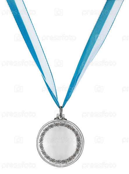 Серебряная медаль с двумя цветными лентами, изолированная на белом фоне