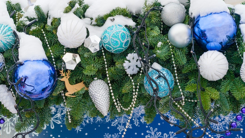 Вид на новогодние игрушки, шарики, конусы, снежинки, висящие на рождественской елке, покрытой снегом