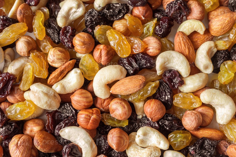 Груда кешью, миндаля, фундука и изюма