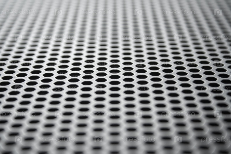 Перспективный вид на металлическую поверхность с регулярными круглыми отверстиями. Промышленный фон (абстракт)