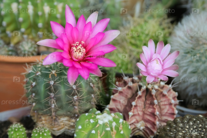 Розовые цветы кактуса Gymnocalycium (медленная глубина резкости)