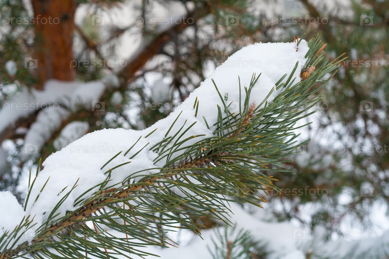 Закрыть вид на ветки ели, покрытые снегом (небольшая глубина резкости)