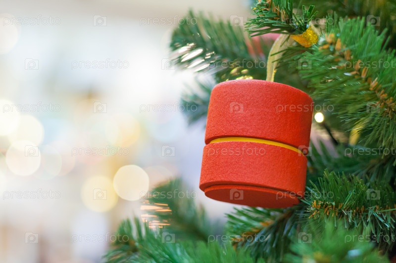 Вид крупным планом на украшение рождественской елки в форме красного цилиндра с размытыми огнями в боке на фоне (пространство для копирования)