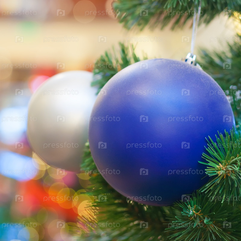 Закрытие рождественской елки с синими и белыми декоративными шариками