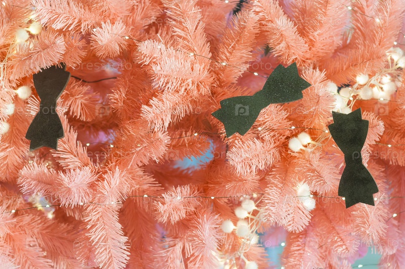 Вид на розовую рождественскую елку с гирляндой