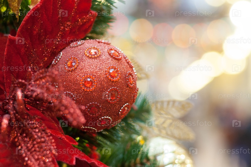 Вид на красный шар, украшенный рубинами на рождественской елке (пространство для копирования)