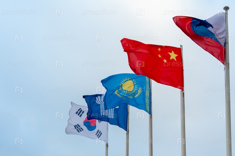 Вид на флаги Китая, Казахстана, Южной Кореи, России и Содружества Независимых Государств на фоне облачного неба